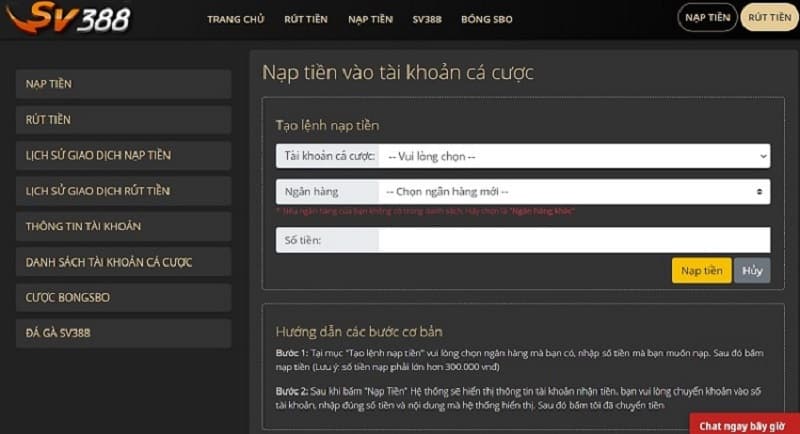 Đăng ký thành công tài khoản tại SV388 thôi chưa đủ, để thỏa sức cá cược anh/em cần phải có tiền để cá cược. Vậy cách thức nạp tiền tại nhà cái này như thế nào? Hãy cùng chúng tôi giải đáp mọi thông tin dưới đây nhé!